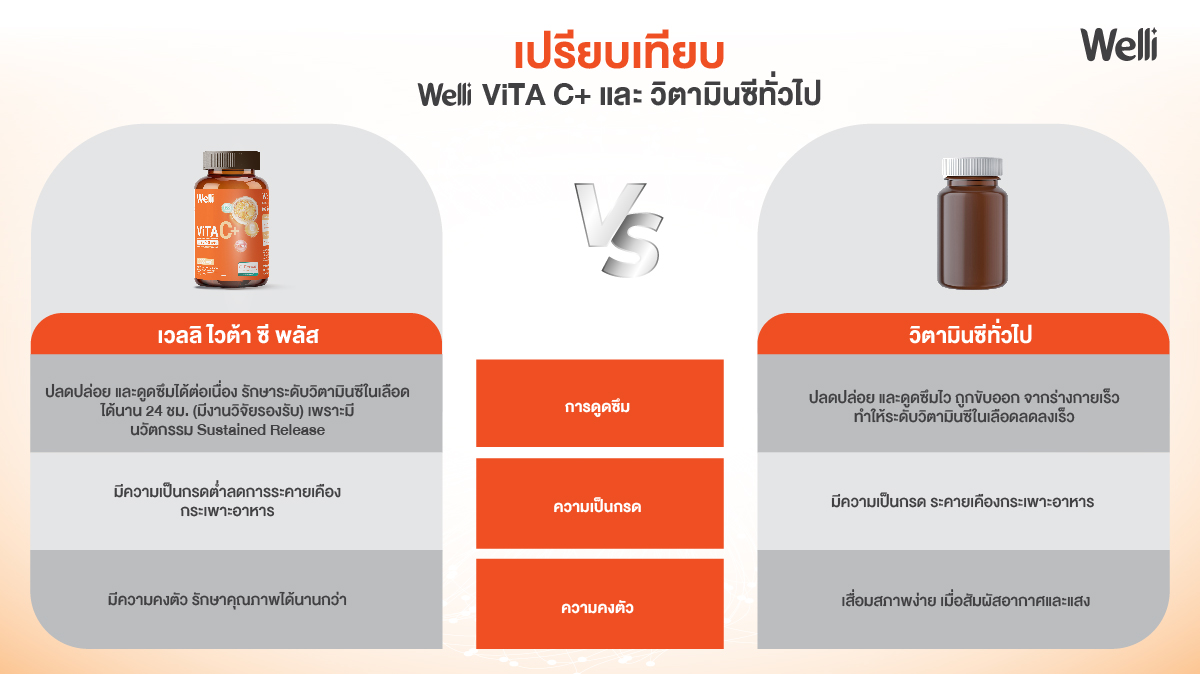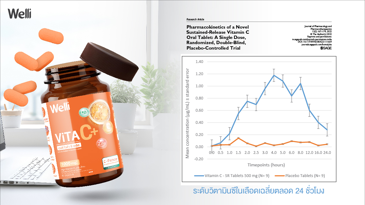 Welli VitaC+ (เวล-ลิ-ไว-ต้า-ซี-พลัส) วิตามินซีที่ถูกพัฒนาขึ้นมาเพื่อตอบโจทย์การดูแลสุขภาพอย่างครอบคลุม ด้วยนวัตกรรมการปลดปล่อยสารอาหารแบบ Sustained Release ที่ทำให้วิตามินซีคงอยู่ในร่างกายได้นานถึง 24 ชั่วโมง โดยใช้เทคโนโลยี Granular DC System และ Polymer Matrix ในการควบคุมการปลดปล่อยอย่างต่อเนื่อง ส่งผลให้ร่างกายสามารถรักษาระดับวิตามินซีในเลือดได้สูงกว่ากลุ่มยาหลอกถึง 13 เท่า และยังช่วยยืดระยะเวลาการคงอยู่ของวิตามินซีในร่างกายได้ต่อเนื่องตลอดทั้งวัน